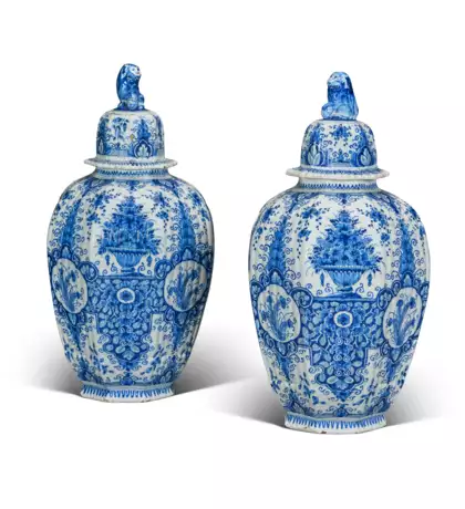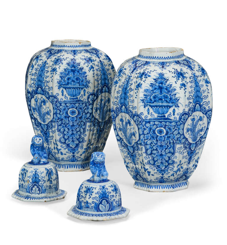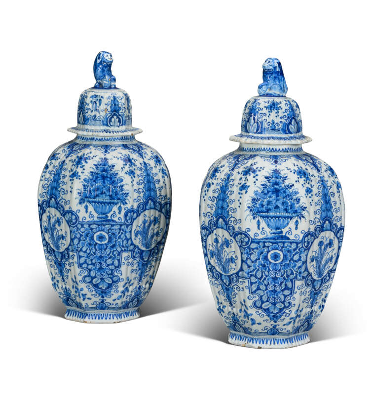 Los 66 | A PAIR OF DUTCH DELFT BLUE AND WHITE RIBBED VASES AND COVERS