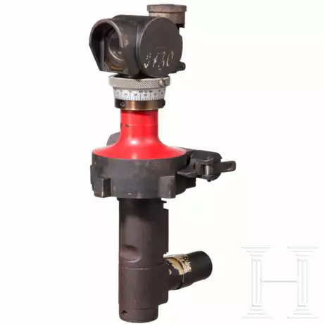 Flugrostiges Eisengehäuse mit Resten der Lackierung und entsprechender Beschriftung mit Herstellercodierung "djg", Verstellungen freigängig, Optik mit Zielstachel. Bestoßen, Vollständigkeit und Funktion nicht überprüft.