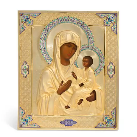 Los 30 | A RUSSIAN SILVER-GILT CLOISONNÉ AND CHAMPLEVÉ ENAMEL ICON OF THE MOTHER OF GOD OF TIKHVIN