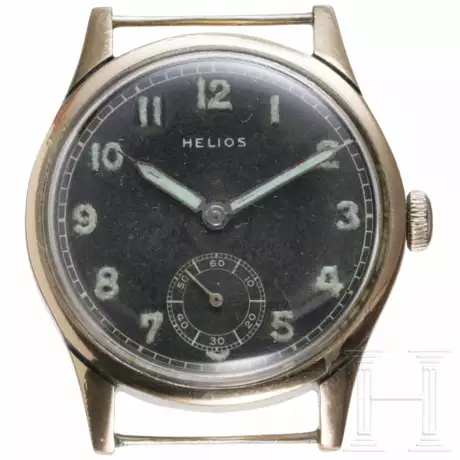 Armbanduhr mit silberfarbenem Gehäuse. Schwarzes Zifferblatt mit nachtleuchtenden arabischen Indizes und Zeigern, kleiner Sekunde auf der "6" sowie Herstelleraufschrift "Helios". Handaufzugswerk im "Wehrmachtskaliber" AS 1130 mit 15 Steinen. Der rs. Schraubdeckel mit punzierter Abnahme "DH" mit laufender Nummer. Durchmesser ohne Krone ca. 33 mm. Funktionsfähig.