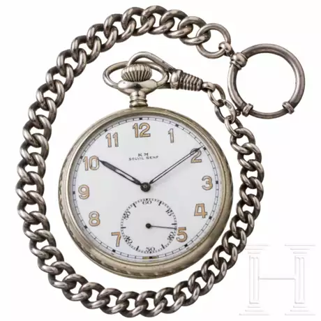 Taschenuhr mit silberfarbenem Gehäuse. Weißes Emaillezifferblatt (Risse) mit nachtleuchtenden arabischen Indizes und Zeigern (Leuchtmasse entfernt), kleiner Sekunde auf der "6", Herstelleraufschrift "Solvil Genf" sowie "KM" für Kriegsmarine.