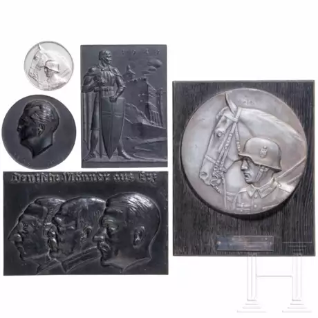 Runde, sichtlich migrierte Plakette mit reliefiertem Bildnis von Ross und Reiter auf einer Holzplakette (Maße ca. 220 x 180 mm) mit nicht gravierter Widmungsplakette. Dazu eine ähnliche, versilberte kleinere Plakette sowie ein rundes Portraitmedaillon (Maße ca. 95 mm) zu Görings 50 Geburtstag 1943 und eine Jahresplakette (Maße 160 x 110 mm) 1942 aus geschwärztem Eisenguss mit den rs. Gießermarken der Preußischen Bergwerks- und Hütten-AG Gleiwitz. Außerdem eine geschwärzte Eisenplakette "Deute Männer aus Erz" mit dem Dreifachbildnis Friedrichs II., Bismarks und des Reichskanzlers.