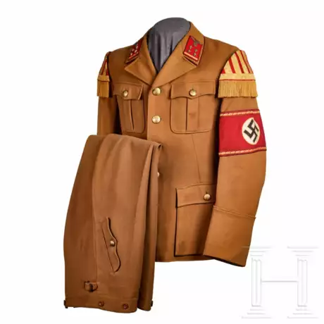 Brown tricot wool, scalloped and pleated breast pockets, hip pockets with straight flaps, four-button front, open collar and French cuffs, gilt finish pebbled buttons of matching manufacturer. Collar tabs for rank of Obergemeinschaftsleiter with gilt finish metal eagle, four gilt finish metal rank pips, golden-yellow tresse stripe on red backing and piped in wine-red, hand-applied. Swallow’s Nest of golden-yellow woven tresse embroidered with swastikas, alternating stripes of red velvet and red velvet band at bottom, braided golden-yellow fringe, applied to shoulder seams with metal hooks. Armband of red wool, border of red bands with gilt woven oakleaves and gilt wire, piped in wine-red, at centre an embroidered black swastika outlined in yellow on a white, circular field, hand-applied. Exhibits moderate moth nips. Aluminum belt ramp hooks at waist. Lined in light yellow cotton with manufacturer stamp at neck and brown cloth RZM tag applied inside pocket. Brown, tricot wool breeches, hidden gly with five brown bakelite buttons, angled waist pockets with scalloped flaps and single gilt-button closures, single rear pocket with scalloped flap and gilt button closure, waist adjustment straps, laced calf closures with three bakelite buttons. Partial lining of grey cotton with manufacturer’s stamp and white cloth RZM tag. Light soiling on tunic.