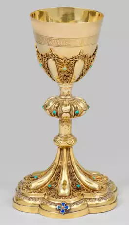 Silber, vollvergoldet. Über sechspassigem, hochgezogenem Fuß Schaft mit breitem, sechspassigen Nodus und konische Kuppa. Fuß und Rand mit durchbrochen gearbeitetem Rankenwerk belegt und mit Türkiscabochons besetzt. Am Fuß schauseitig ein emailliertes Kreuz. Auf der Kuppa umlaufend die Inschrift "Hic est calix sanguinis mei". Best.; Gest. Beschauzeichen, unbekanntes Meisterzeichen "J & C". Gew. ca. 430 g. H. 24 cm.