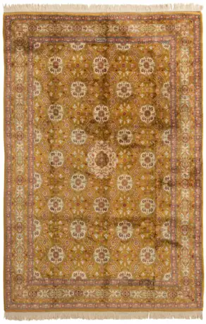 N-Indien, um 1940. Oben in der Mitte signiert mit "Nour Khan Kashmiri". Dekorative Musterung. Das goldgelbe Mittelfeld ist mit in diagonalen Reihen angelegten Blütenpalmetten durchgehend belegt, flankiert von dekorativ platzierten Blattranken und filigranen, elegant gestreuten Floralmotiven. 2 rote Rosettenborten umgeben die ebenfalls goldgelbe, mit Kreuzkartuschen und Blüten belegte Hauptbordüre, die mit der Musterung des Innenfeldes korrespondiert. Sehr gute Erhaltung. 258x368 cm (ft. 8.5x.12.1).
