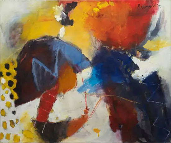Lyrisch-abstraktes Spiel in leuchtenden Farben, teilweise flächig und pastos aufgetragen. Nach seiner Jugendzeit in Australien studierte der niederländische Künstler an der Akademie der bildenden Künste in Maastricht, u.a. bei Gilbert de Bontridder und Peter Wehrens. Öl/Lwd.; R. oben u. verso sign. u. datiert (19)93. 100 cm x 120 cm. Rahmen.