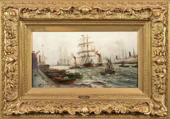 Der deutsch-dänische Künstler Alfred Jensen gehört zu den versierten und gefragten Marinemalern der Jahrzehnte vor und nach 1900. Reges Treiben im Hafen mit Dampf- und Segelschiffen bildet seinen vornehmlichen Motivkreis. Jensen fuhr zunächst selbst zur See, bevor er sich in Hamburg und an der Akademie in Kassel zum Maler umschulte. Aufgrund seiner spezialisierten Fähigkeiten wurde er 1900 an der Hamburger Kunstgewerbeschule zum Professor berufen. Öl/Lwd.; L. u. sign.; 25,5 cm x 47,5 cm. Rahmen.