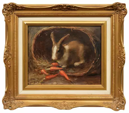 Fein nuancierte, einfühlsame Schilderung eines Hasen, der sich mit ein paar Möhren in einen Weidenkorb zurückgezogen hat. Öl/Holztafel. R. u. sign.; 19,4 cm x 25,6 cm. Rahmen.