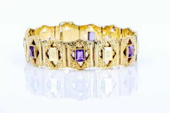 585 Gelbgold, getestet, 6 Amethyste im Carrée-Schliff, Länge ca. 19 cm, Gesamtgewicht ca. 29,4 g, Gebrauchsspuren in Form von Kratzern und feinen Bereibungen, ein Amethyst deutlich bestoßen, Sicherheitsverschluss unter Spannung im geschlossenen Zustand