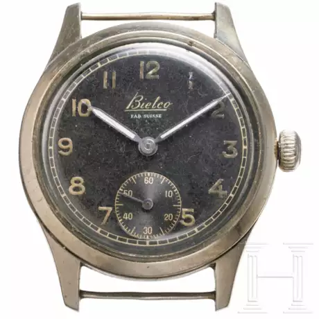 Armbanduhr mit blankpoliertem Messinggehäuse, schwarzem Zifferblatt mit Markenname "Aristo", Leuchtindizes und -zeigern. Handaufzug, ein Formwerk mit Kaliberbezeichnung(?) "521". Der rs. Deckel mit punzierter Abnahme "DH" und laufender Nummer. Durchmesser ohne Krone ca. 35 mm. Funktionsfähig.
