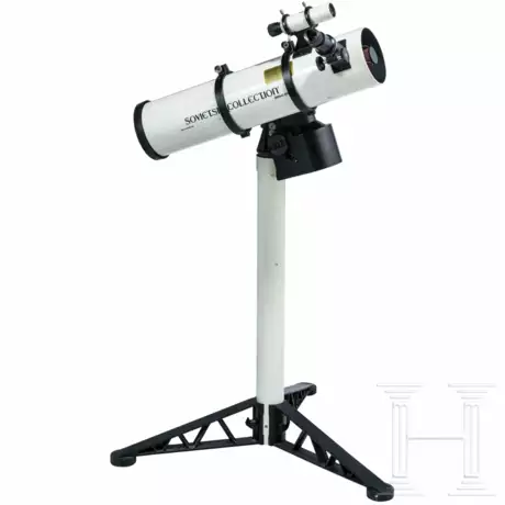 Stahl, Leichtmetall, Glas, Gummi, schwarzweiß lackierte Oberflächen. Rohrdurchmesser 14 cm. Unter dem Objektivdeckel aus Gummi das Etikett "Amateur Astronomer Telescope N 0810 1997 Made in Russia". Seitliches Okular, bezeichnet "Plossl 25 mm". Auf Stativ. Gebrauchs- und Altersspuren. Rohrlänge 62 cm, Breite 80 cm, Höhe 113 cm.