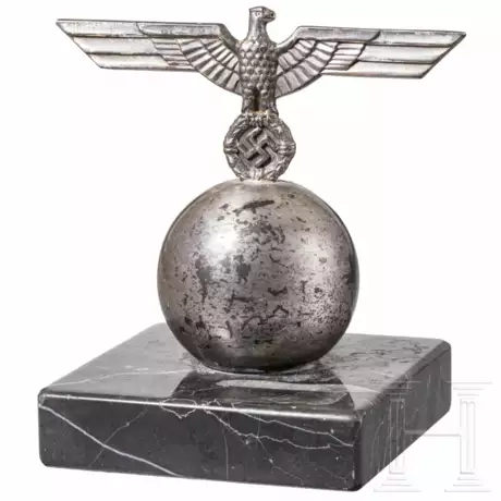 Hoheitsadler auf einer Kugel, Metall versilbert, montiert auf einer schwarzen Marmorplatte, patriotische Eigenfertigung aus der Zeit, Maße ca. 10,5 x 10 cm. Alters- und Gebrauchsspuren.