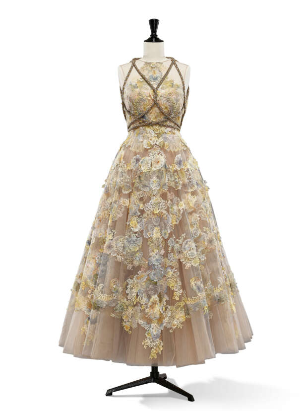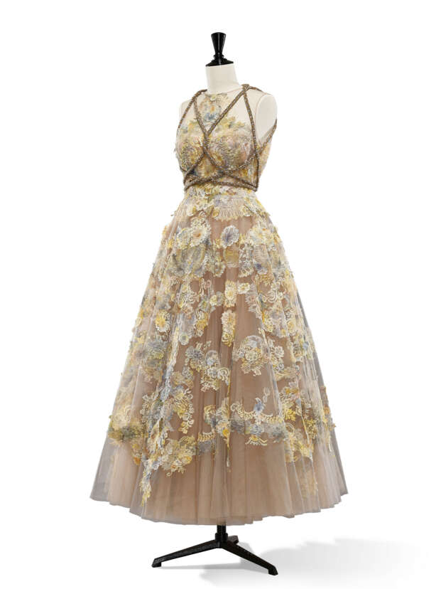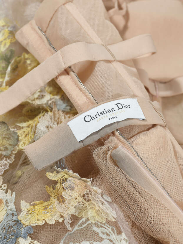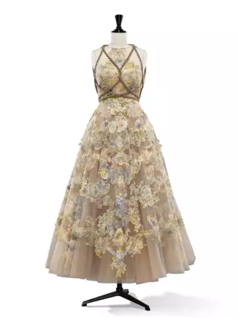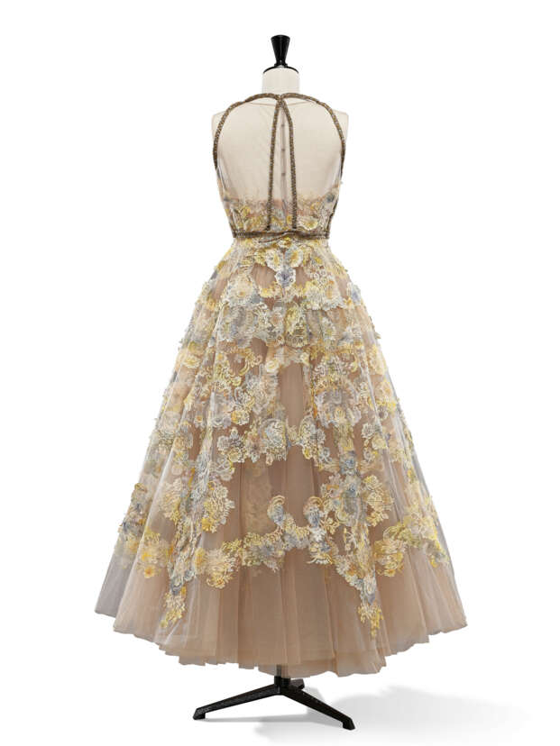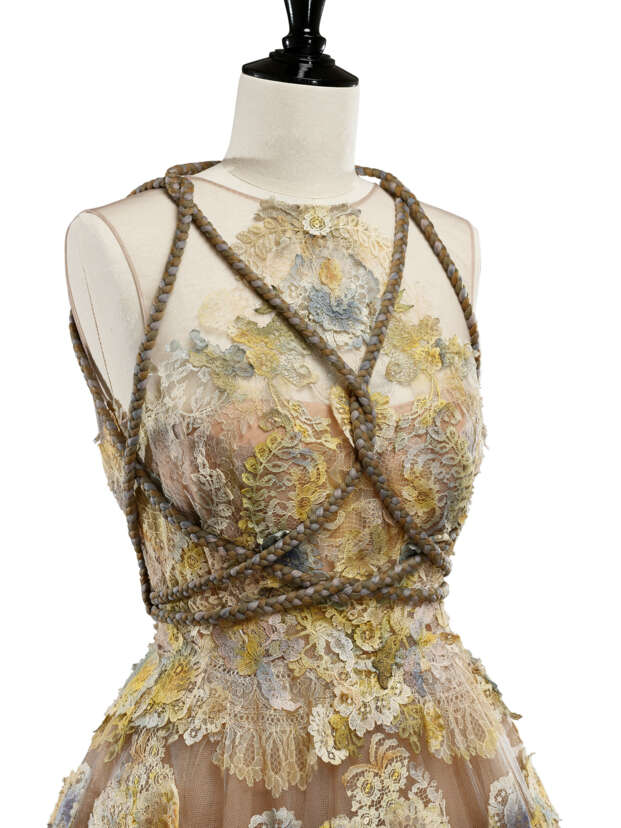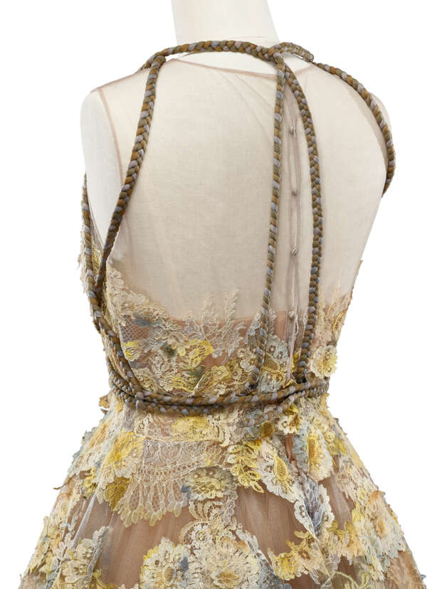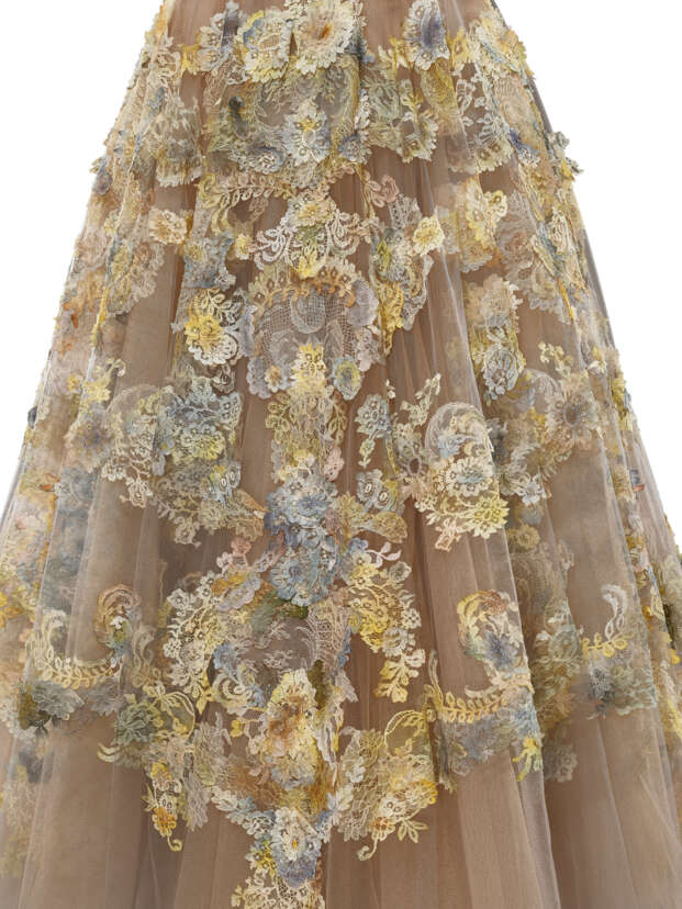 Los 104 | AN ENCHANTING HAUTE COUTURE DAWN GLITTER TULLE DRAPED GRECIAN COLUMN FLORAL EMBROIDERED CHANTILLY LACE DRESS