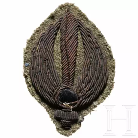 In Gold (stark gedunkelt) auf khakifarbenem Tuch gestickt. Selten.