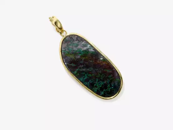 Gelbgold 585/-, getestet. 1 Boulderopal von ca. 32 x 14 mm. Der Anhänger ist sehr gut erhalten, er weist lediglich minimale altersbedingte Gebrauchsspuren auf. Ca. 4,4 x 1,7 cm. Ca. 7 g.