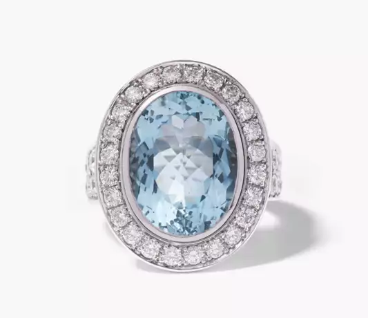 750 Weissgold. Stilvoller Aquamarin-Ring mit einem ovalem, natürlichem Aquamarin, ca. 17x12,84x7,71 mm, in einer Brillant-Entourage und Ringschultern mit Diamantpavé von zus. ca. 2 ct. Gr. 57, 23 g.