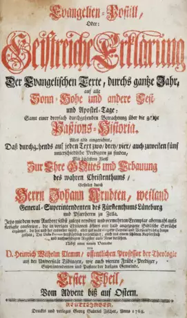 Predigtsammlung des Lüneburger General-Superintendenten Johann Arndt. Das gest. Portrait im Text zeigt den Verfasser. Der zweite Teil mit eigenem Titelblatt. - Etw. Gebrauchsspuren.