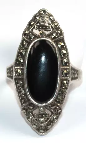 Los 875 | Art-Deco-Ring, Silber (geprüft), großer, navetteförmiger Ringkopf besetzt mit ovalem Onyx-Cabochon und Markasiten, Ges.-Gew. 6,0 g, RG 52