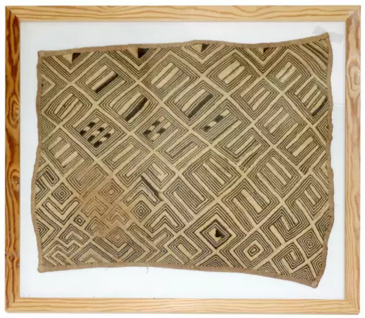 Geometrische Muster ähnlich Abb. 25 aus: Traumzeichen. Raphiagewebe des Königreichs Bakuba. Hrsg. Haus der Kulturen der Welt. Mit e. Text v. Georges Meurant, Einführung A.Tunis. Mchn., F.Jahn (1989). - Das Buch liegt bei.