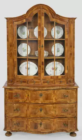 Nussbaum, furniert. Gerader, querrechteckig angelegter Korpus auf schmaler Zarge und gedrückten Füßen. In der gegliederten Front drei breite, geschweifte Schubladen. Korrespondierender, zurückgesetzter Aufsatz mit zwei sprossenverglasten Vitrinentüren sowie kleinen Schubfächern. Geschweift ansteigendes Kehlgesims. Flächendeckend breit gerahmte Furnierfelder. H. 203 cm. 119 cm x 64 cm.