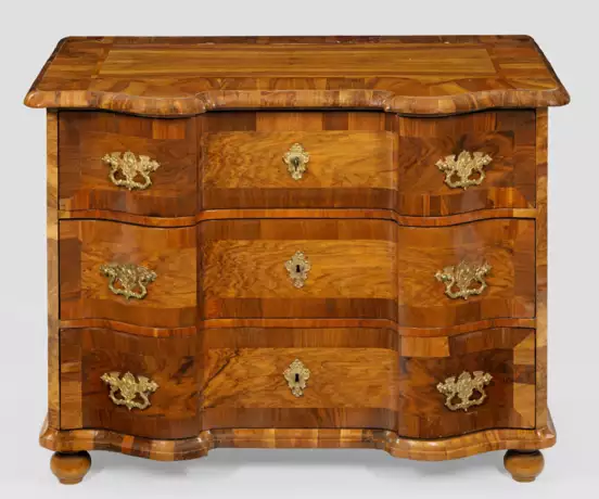 Nussbaum, furniert. Gerader Korpus auf schmaler Zarge und gedrückten Füßen. In der gegliederten Front drei gegenläufig geschweifte Schubladen. Korrespondierende, gering überstehende Deckplatte. Flächendeckend breit gerahmte Furnierfelder. Erg.; Altersspuren. H. 79,5 cm.105 cm x 61 cm.