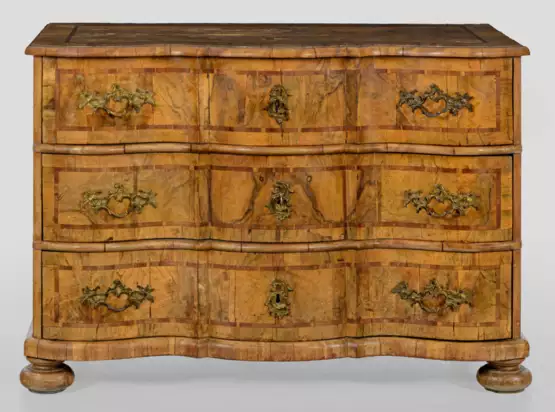 Nussbaum, furniert sowie Einlagen aus Pflaumenholz. Gerader, querrechteckig angelegter Korpus auf schmaler, gerundeter Zarge und gedrückten Füßen. In der gegliederten Front drei breite, gegenläufig geschweifte Schubladen. Gering überstehende Deckplatte. Flächendeckend breite gerahmte Furnierfelder, von Bandeinlagen begrenzt sowie floral gestaltete Griffe. Altersspuren. H. 78 cm. 111 cm x 59 cm.