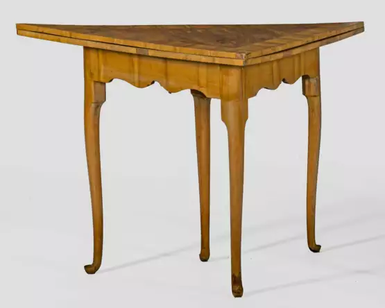 Helles Nussbaum furniert und Buchenholz. Passig geschweifte, dreieckig angelegte Zarge auf leicht geschweiften, rücks. ausziehbaren Beinen als Träger für klappbare Deckplatte. Unterhalb gemuldete Reserven für Spieleinsätze. H. 80 cm. 117 cm x 57/114 cm.