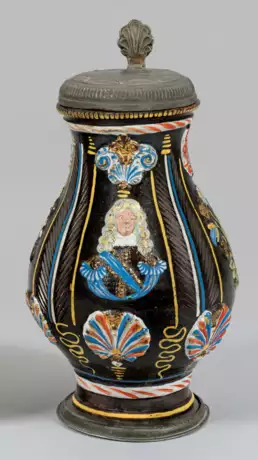 Sog. "Annaberger Krug". Steinzeug, dunkelbraunschwarz engobiert und salzglasiert. Aufgelegter und mit polychromen Emailfarben bemalter Dekor aus einem Fürstenbildnis, Blütenstängeln und Palmetten- und Rankenmotiven mit Trauben; vertikale Gliederung durch fliederblattartige, vertikale Pilasterbänder im Kerbschnitt. Zinngefasster Stand und Zinndeckel mit Muscheldrücker, Stadt- und Meistermarke mit Dat. 1708. H. 24,5 cm.