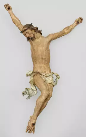 in naturalistischer Körperlichkeit, vollrund aus Lindenholz geschnitzter Corpus Christi im Dreinageltypus als "christo vivo", ehemals an einem Kreuz befestigt. Die Seitenwunde ist durch rote Farbreste noch zu erkennen, wurde jedoch nicht mitgeschnitzt. Der Körper, das stark akzentuierte Lendentuch und die gespreizten ersten beiden Zehen (wohl als Siegeszeichen für die bevorstehende Auferstehung zu deuten), erinnern an das Kruzifix (um 1770) vom berühmten bayerischen Bildschnitzer Ignaz Günther, im Stadtmuseum in München. Die Ausarbeitung des Kopfes an den Christuskorpus (1765/75) in der Katholischen Pfarrkirche Sankt Jakobus der Ältere, in Vierkirchen (nördlich von München), ebenfalls von Günther. In den Aufzeichnungen der Slg. Dr. Hubert Wilm, München wird ein Christuskorpus (um 1780) von Christian Jorhan d. J. aufgeführt, welcher große Ähnlichkeiten zu dieser Skulptur aufweist. Reste originaler Fassung unter der späteren Übermalung erhalten. Kreuzbalken verloren. Finger teilw. erg. sowie Dornenkrone. H. 63 cm.