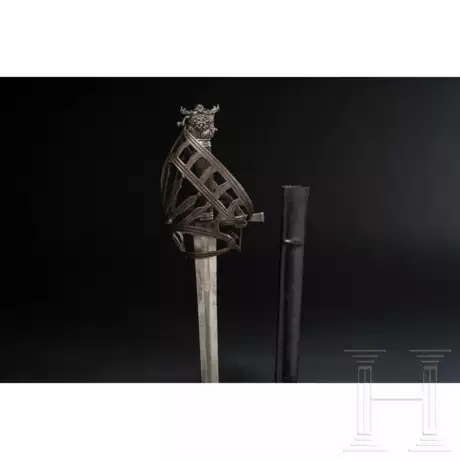 Sturdy double-edged sword blade of flattened hexagonal section, the edges slightly jagged in places. At the base silver strip with engraved inscription "MEFECIT POTSDAM 1729 - NON SOLI CEDIT 1729" inlaid on each side. Reused iron basket hilt (slightly pitted) from the 17th century. Grip with fine chequering. Silver cat’s head pommel in fine relief with flower décor. Original leather-covered wooden scabbard with silver chape with floral decoration in relief and silver reinforcement bands. Length 103 cm. In the 18th century, the originally Venetian schiavona was much sought after by officers as a fashionable sidearm.