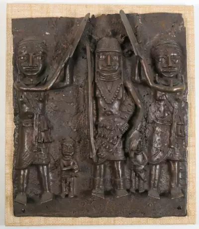 Auf Platte montiertes Bronzerelief mit drei Kriegern u. einer Kinderfigur. Relief 46 x 38 cm.