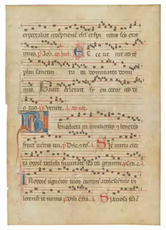 580 x 392mm. The initial ‘B’ opening ‘Benedicta tu in mulieribus', ten lines of text and music, reverse (originally the recto) with 6 initials alternately in blue and red with red or purple penwork flourishing and folio no XXVIII in red. Mounted.