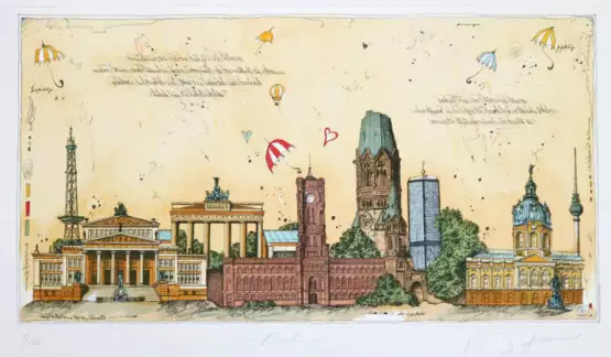 ╔Ders.╗Berlin - Gedächtniskirche. Farbradierung. Plgr. 14,7 x 10,7 cm. Blgr. 30 x 24 cm. - Ex. 120/250. -╔Ders.╗ Brandenburger Tor. Farbradierung. E.A. 14,1 x 11,2 cm. Blgr. Ca. 30 x 24 cm.