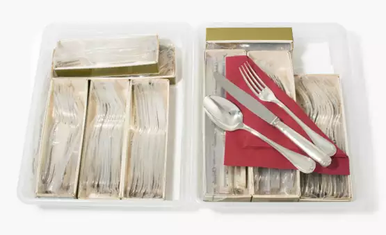 Frankreich, 20.Jh. Versilbert, 108-teilig. Herstellermarke Christofle "Malmaison". Bestand: 12 Fischmesser und 12 -gabeln, 12 Tafellöffel, 12 -messer und 12 -gabeln, 12 Dessertlöffel und 12 -gabeln, 12 Kuchengabeln, 12 Kaffeelöffel.