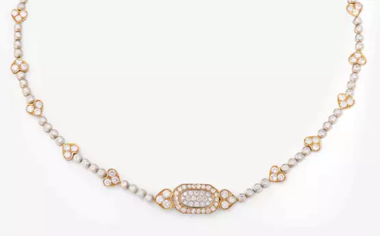 750 Gelb-/Weissgold. Feines Collier mit einem pavégefassten, oktagonalen Mittelelement. Kleine, brillantbestückte Herzen wechseln sich mit Brillanten von ca.8.90 ct, G-vs. L 35 cm, 23 g. Mit Dokument.