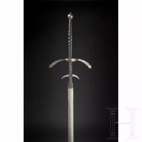 Broad blade with straight cutting edges. Long ricasso with two sturdy guards, original leather cover, with several flower-shaped embossed marks. A Passau wolf mark incised on one side at the root of the blade. The lightly engraved iron quillons angled toward the blade. Double guard rings on both sides, the outer rings lightly engraved. The grip with the original leather cover. Heavy, spherical pommel. Length 169 cm.