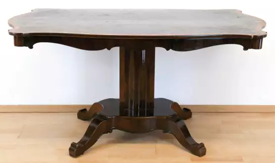 Los 979 | Biedermeier-Couchtisch, Mahagoni furniert, über 4-passigem Fuß im Querschnitt oval geschweifte Säule, 4seitig geschweifte Platte, 62x126x73 cm