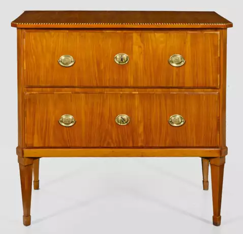 Kirschbaum, furniert. Gerader, querrechteckig angelegter Korpus, flankiert von schmalen, schräggestellten Ecklisenen, auf konischen Vierkantbeinen. In der gegliederten Front zwei Schubladen. Gering überstehende Deckplatte. H. 81 cm. 87 cm x 48,5 cm.