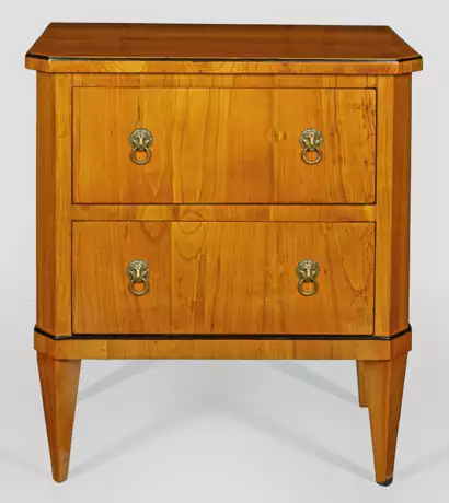 Kirschbaum, furniert und teilw. ebonisiert. Gerader, hochrechteckiger Korpus, flankiert von schmalen, schräggestellten Ecklisenen auf flacher Zarge und gekanteten Vierkantbeinen. In der gegliederten Front zwei Schubfächer. Gering überstehende Deckplatte. Rest.; H. 74 cm. 64 cm x 40,5 cm.