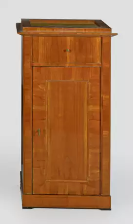 Kirschbaum, furniert. Gerader, hochrechteckiger Korpus auf gekantetem Zargensockel. In der gegliederten Front eine Tür sowie oberhalb Schubfach. Profilgerahmte Deckplatte aus lackiertem Marmor. H. 93 cm. 50 cm x 40 cm.