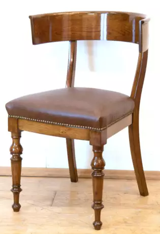 Los 972 | Biedermeier-Stuhlsessel, 19. Jh., sog. Klismos-Stuhl, polierte Eiche, gebogenen Rückenlehne, neu gepolstert und Leder neu bezogen, 81x55x50 cm
