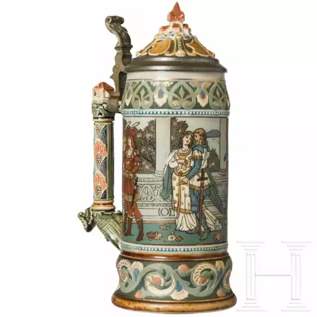 Feinsteinzeug mit farbiger Fassung. Zylindrischer Krug mit Jugendstil-Zierfriesen und umlaufender Bildszene. Zinnmontierter Deckel mit Bekrönung in Form einer Burg. Aufwändig gearbeiteter Henkel mit Gargylen-Figur. Maßangabe "1 L", auf dem Boden gestempelte Herstellerbezeichnung und Modellnummer "2391". Guter, unbeschädigter Zustand. Höhe 27, 5 cm.