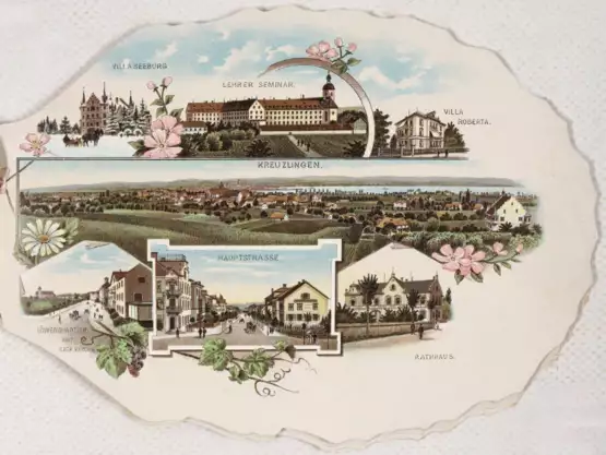 ╔Dabei: Gruss vom Bodensee╗ (Deckeltitel). Städterose mit 8 Bl. kolor. Ansichten in Fächerform, O.O.u.Vlg. (um 1880). Qu.8°.