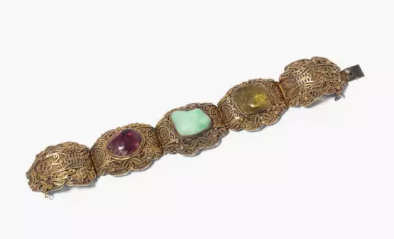 China, 20.Jh. Vergoldetes Silberfiligran. Fünfgliedriges Armband mit diversen Schmucksteinen. L 18 cm. Mit Box.