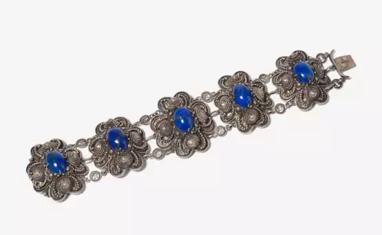 China, 20.Jh. Silberfiligran mit Lapislazuli. Fünf blütenförmige Glieder. Verschluss mit Silberpunze. L 18 cm. Mit Box.