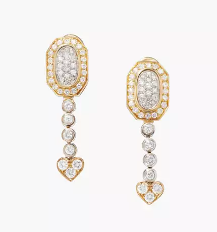 750 Gelb-/Weissgold. Oktagonales Schild über einer Reihe von Brillanten und einem herzförmigen Abschluss, Brillanten von ca. 1.00 ct, G-vs. L 3,5 cm, 8 g. Mit Dokument.