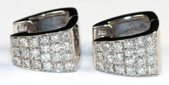 Los 785 | Brillant-Scharniercreolen, 585er WG, ausgefasst mit 42 Brillanten von zus. ca. 0,84 ct., VS-Si, Ges.-Gew. 7,54 g, L. 13 mm, B. 9 mm (Wiederbeschaffungswert lt. Expertise 3.920,- €)
