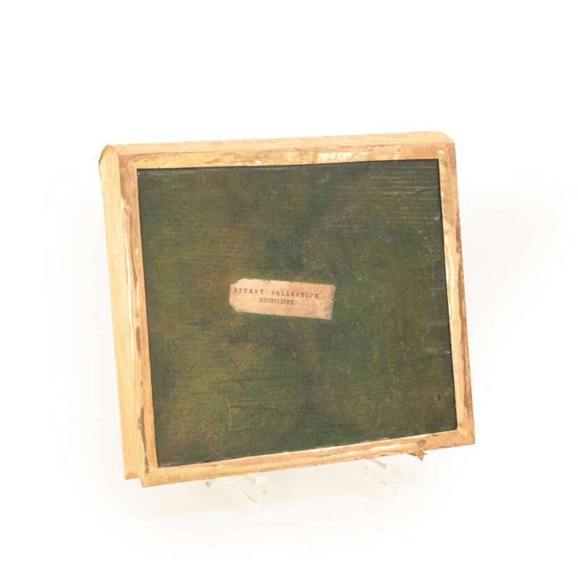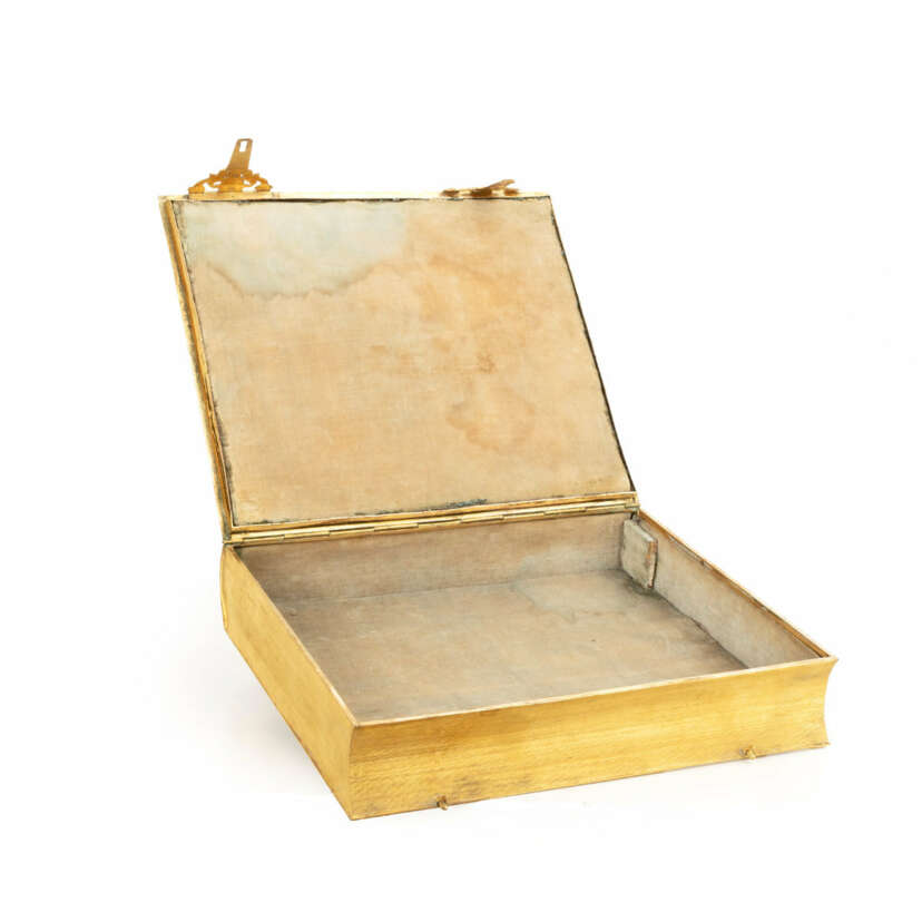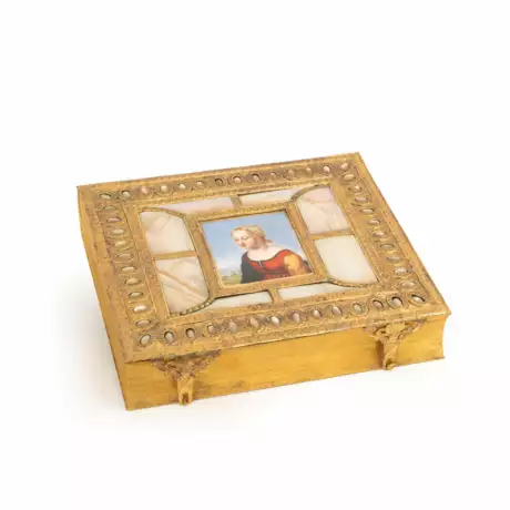 Um 1830, Messing, vergoldet, Porzellan, Perlmutt, Leder und Samt, 23 x 25,5 x 6 cm, feine Porzellanmalerei nach einem Vorbild von Raffaello Santi, umlaufende Palmetten und Rosenranken, die Buchschließe wird am Scharnier durch Füllhörner bekrönt, partiell berieben, einige Permluttcabochons haben sich in ihrer Fassung abgesenkt, hellblauer Samt im Inneren stark ausgeblichen, fleckig, neuzeitliche Klebespuren an den Rändern der Einfassung