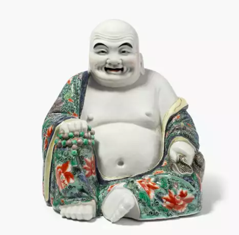 China, 20.Jh. Porzellan. Sitzender, herzhaft lachender Budai mit Gebetskette in seiner Rechten und gefülltem Sack in seiner Linken. Polychromer Rankendekor. H 29 cm. Mit Holzsockel. GH 39 cm.