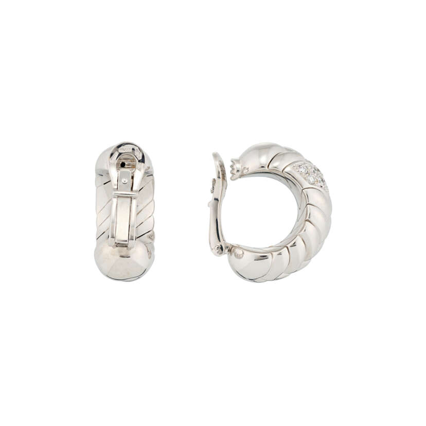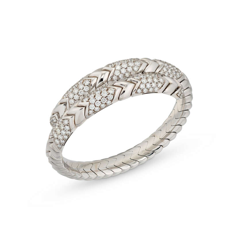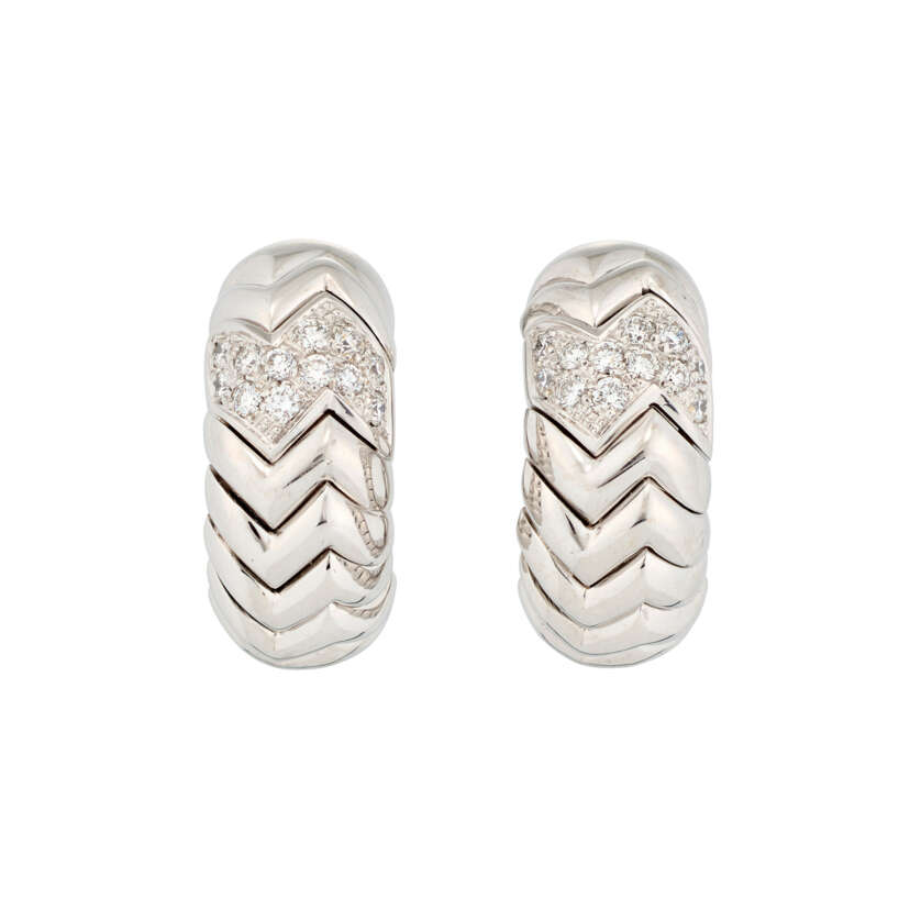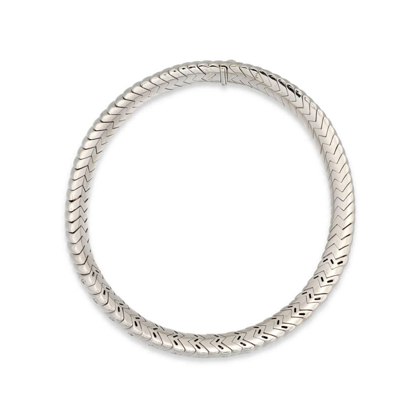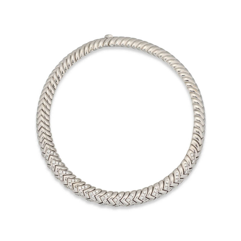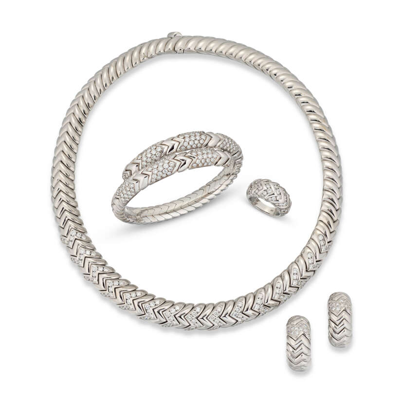 Designed as bombé bands of zigzag motifs, circular-cut diamonds, signed Bvlgari, necklace, earrings and ring with maker's mark (Bulgari Gioielli spa), bangle with maker's mark (Sodiamo S.A.M.), black Bulgari presentation case with outer box